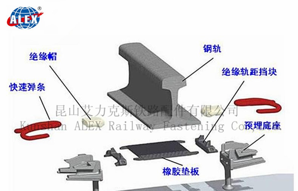 KPO扣板轨道扣件系统 一、铁路轨道扣件系统的作用 铁路钢轨扣件是轨道上用以联结钢轨和轨枕(或其他类型轨下基础)的零件,又称中间联结零件。其作用是将钢轨固定在轨枕上,保持轨距和阻止钢轨相对于轨枕的纵横向移动。.